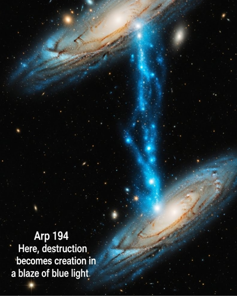 Arp 194 stands as one of the universe’s most compelling examples of how destruction becomes creation. What appears as cosmic chaos is, in reality, a precise sequence of gravitational interactions forging new stars in radiant blue light. By studying this system, astronomers gain deep insights into galaxy evolution, starburst formation, and the life cycles of cosmic structures. Arp 194 is a reminder that even in the universe’s most turbulent moments, creation thrives.