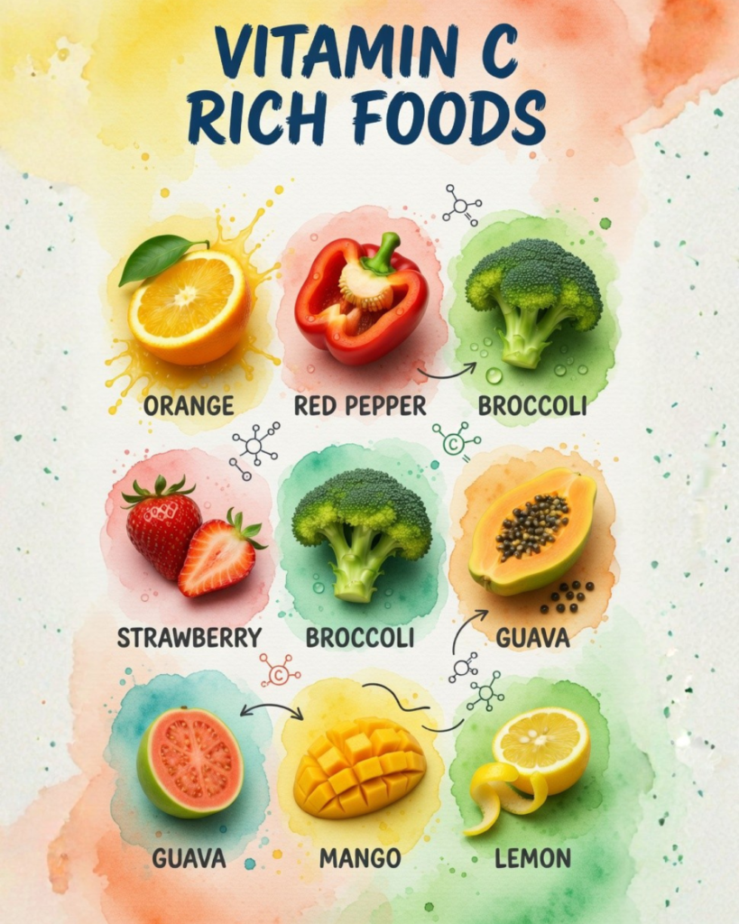 Vitamin C (ascorbic acid) is a water-soluble antioxidant that supports immunity, collagen production, iron absorption, and even mood stability. In this complete guide you will discover the top vitamin C rich foods, exactly how much each provides, the science-backed benefits, practical ways to add them to your meals, easy recipes that fit the “different foods for different feelings” approach we’ve covered before, and smart tips to preserve every milligram. You’ll also see how these foods slot perfectly into a healthy lifestyle—pairing beautifully with daily walking, magnesium lotion, and your DIY calendula-rosehip face cream for inside-out glow.