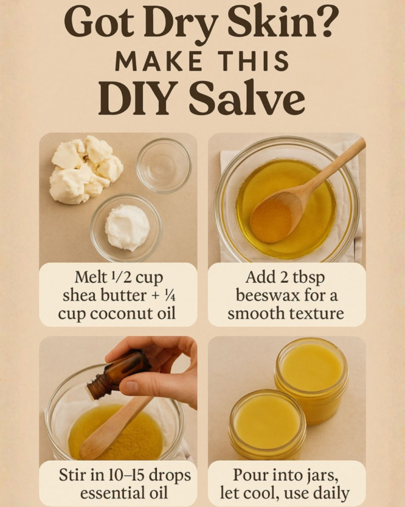 Dry skin — characterized by transepidermal water loss (TEWL) exceeding the skin’s capacity to maintain barrier integrity — affects an estimated 40-50% of adults chronically and nearly everyone episodically during winter or in low-humidity environments. This DIY shea butter salve addresses dry skin through the same dermatological principles employed in pharmaceutical emollients: occlusion to prevent water loss, emollience to improve barrier lipid composition, and humectancy to attract moisture into the stratum corneum. Shea butter (Vitellaria paradoxa) provides an exceptional lipid matrix rich in stearic acid, oleic acid, and the triterpene compounds (lupeol, α-amyrin, β-amyrin) with documented anti-inflammatory activity, while complementary ingredients enhance penetration and target specific aspects of barrier dysfunction. This formulation delivers professional-grade dry skin relief in a preparation you can make in under 20 minutes with ingredients whose complete composition you understand and control.