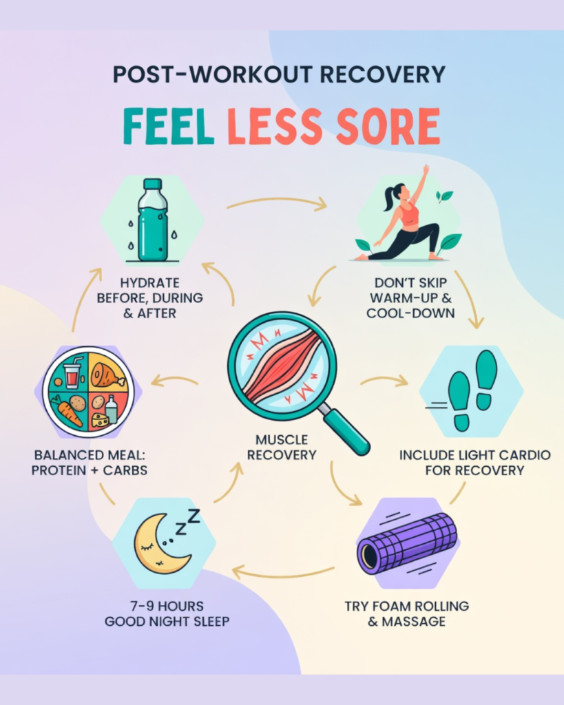 Feeling sore after a workout doesn’t have to slow you down or kill your motivation. These six simple, science-backed tips — gentle movement, smart refueling, quality sleep, hydration, self-massage, and contrast therapy — give your body exactly what it needs to repair faster and come back stronger. Start with just two or three that feel easiest today, and you’ll notice the difference in how you feel tomorrow.