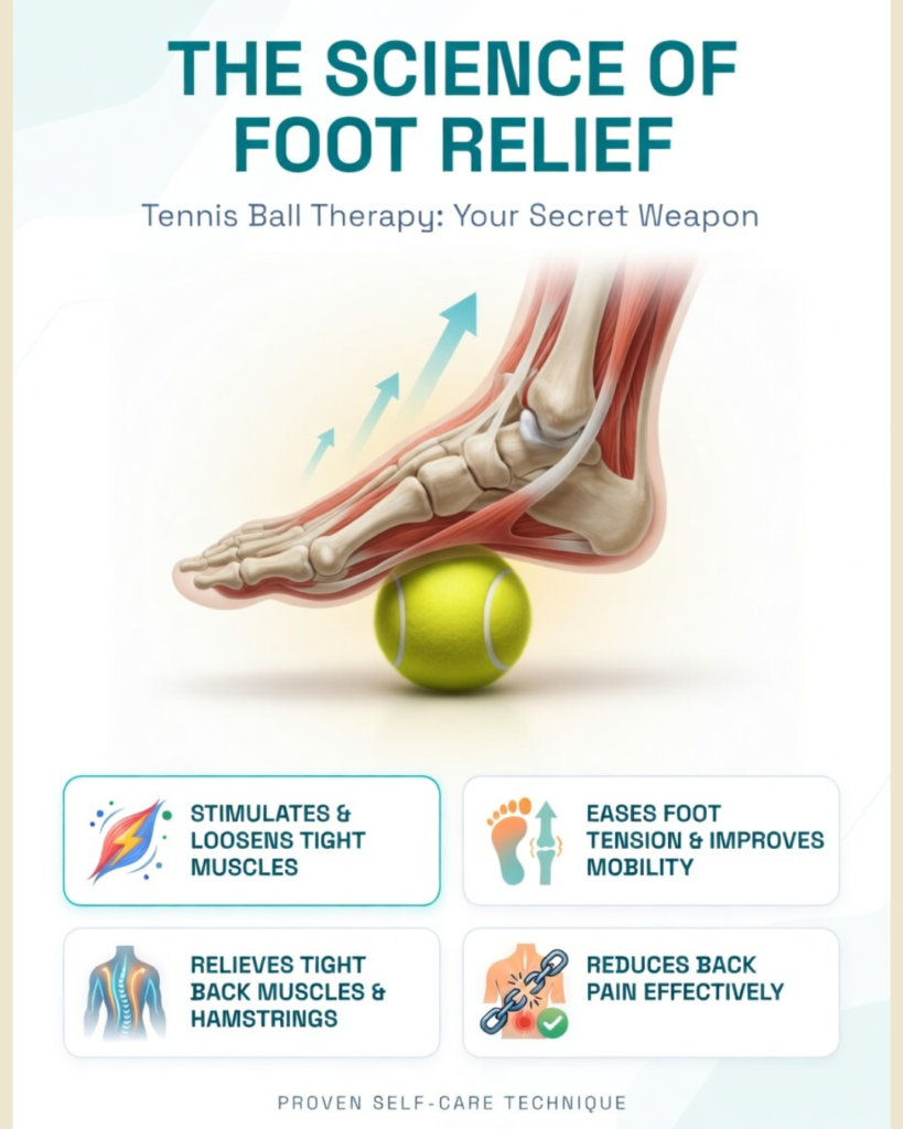 Rolling a tennis ball under your foot is one of the simplest yet most effective at-home tricks for releasing tight muscles, improving mobility, and even reducing back pain. It takes just minutes, costs nothing, and fits into any busy schedule. The science and real results speak for themselves — better circulation, less tension, and a calmer body from the ground up. Try it tonight before bed and feel the difference tomorrow. Your feet (and the rest of you) will thank you for this small habit with big relief. Save this guide, share it with anyone who stands or walks a lot, and enjoy the simple joy of moving through your day with lighter, happier feet.