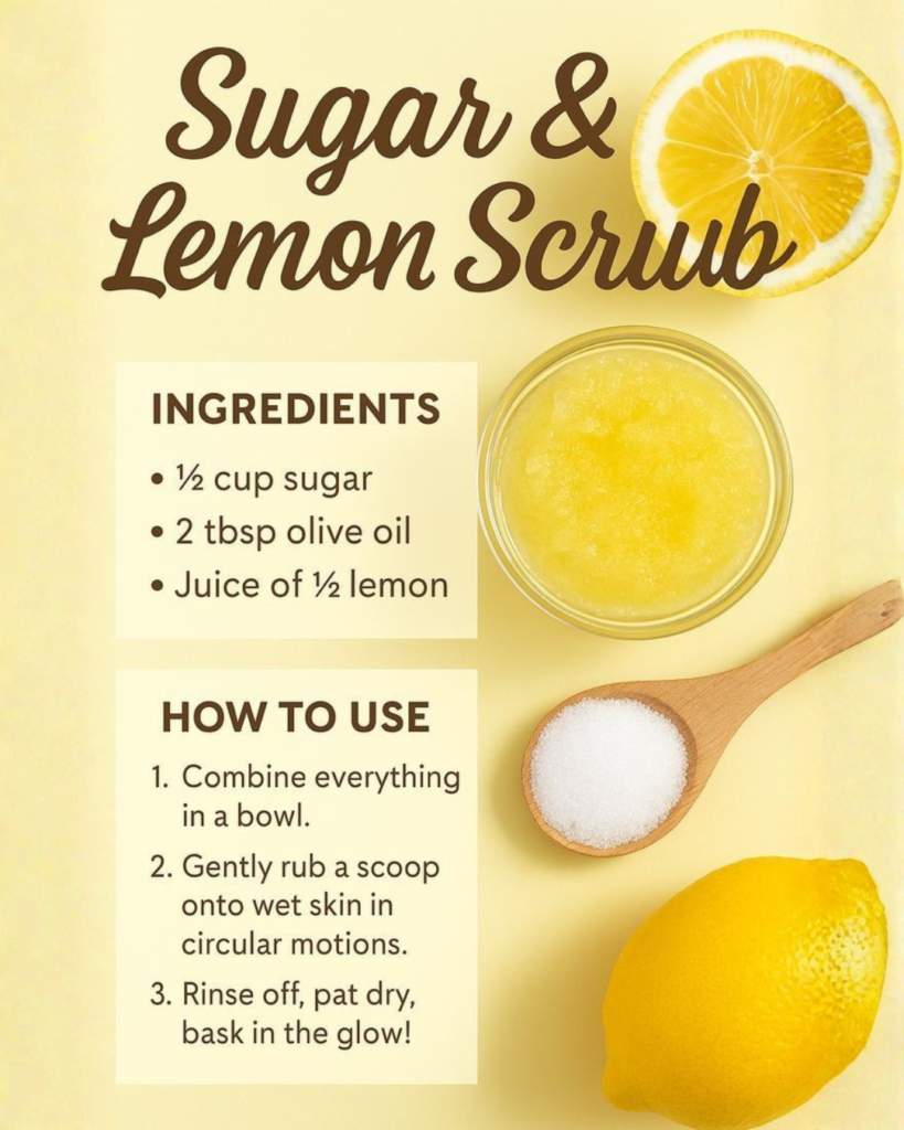 A sugar and lemon scrub is a simple DIY skincare remedy that can help exfoliate the skin, improve texture, and support a brighter appearance when used correctly.