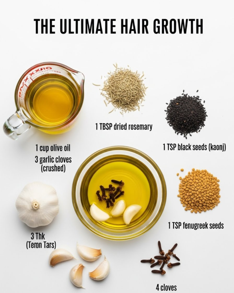 Discover the ultimate hair growth oil made with olive oil, rosemary, black seeds, fenugreek, and cloves to strengthen roots and boost growth naturally.