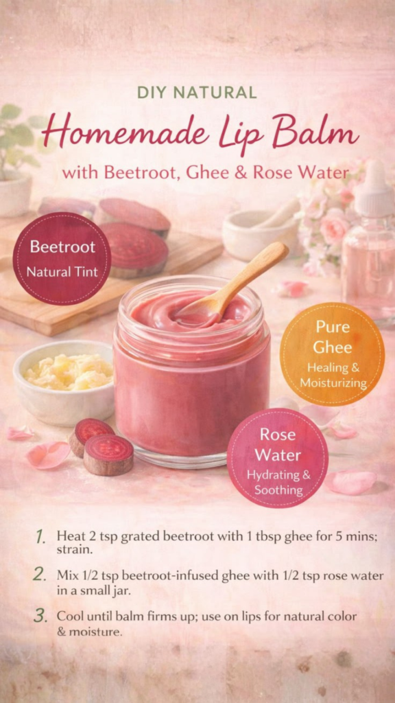 Creating this simple homemade lip balm made with beetroot, pure ghee, and rose water is an empowering way to reclaim your beauty routine from harsh chemicals. You have learned how to harness the moisturizing power of ghee, the vibrant tint of beetroot, and the soothing essence of rose water to keep your lips soft and hydrated. This gentle, chemical-free remedy is more than just a cosmetic; it is a small act of self-care that you can easily perform at home.
