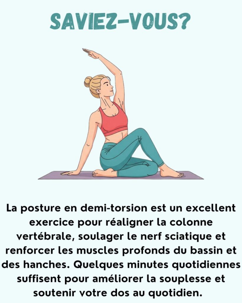 Bien que moins évident qu’une posture d’ouverture thoracique, la demi-torsion influence positivement la fonction respiratoire. En mobilisant la cage thoracique dans un plan de rotation, elle préserve l’élasticité des articulations costo-vertébrales, souvent rigidifiées par les postures statiques prolongées.