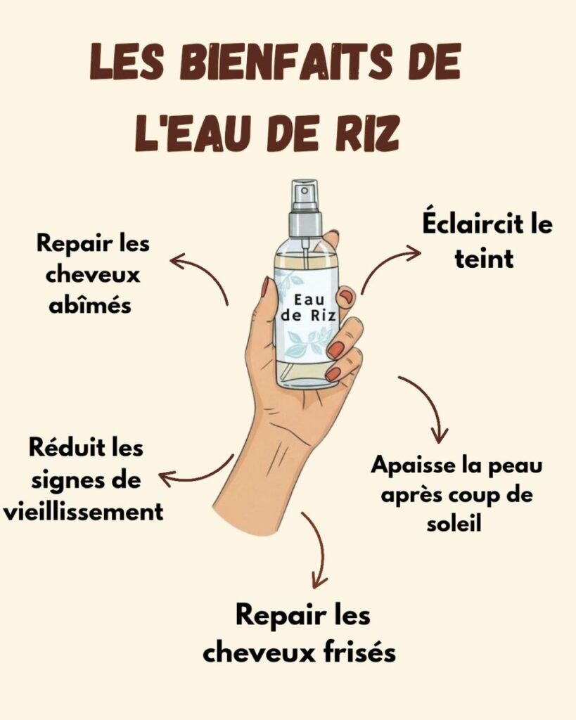 Évitez l’utilisation sur une peau lésée, des plaies ouvertes ou des infections actives. L’eau de riz ne constitue pas un traitement médical et ne doit jamais remplacer les soins prescrits par un professionnel de santé pour les affections dermatologiques ou capillaires diagnostiquées.